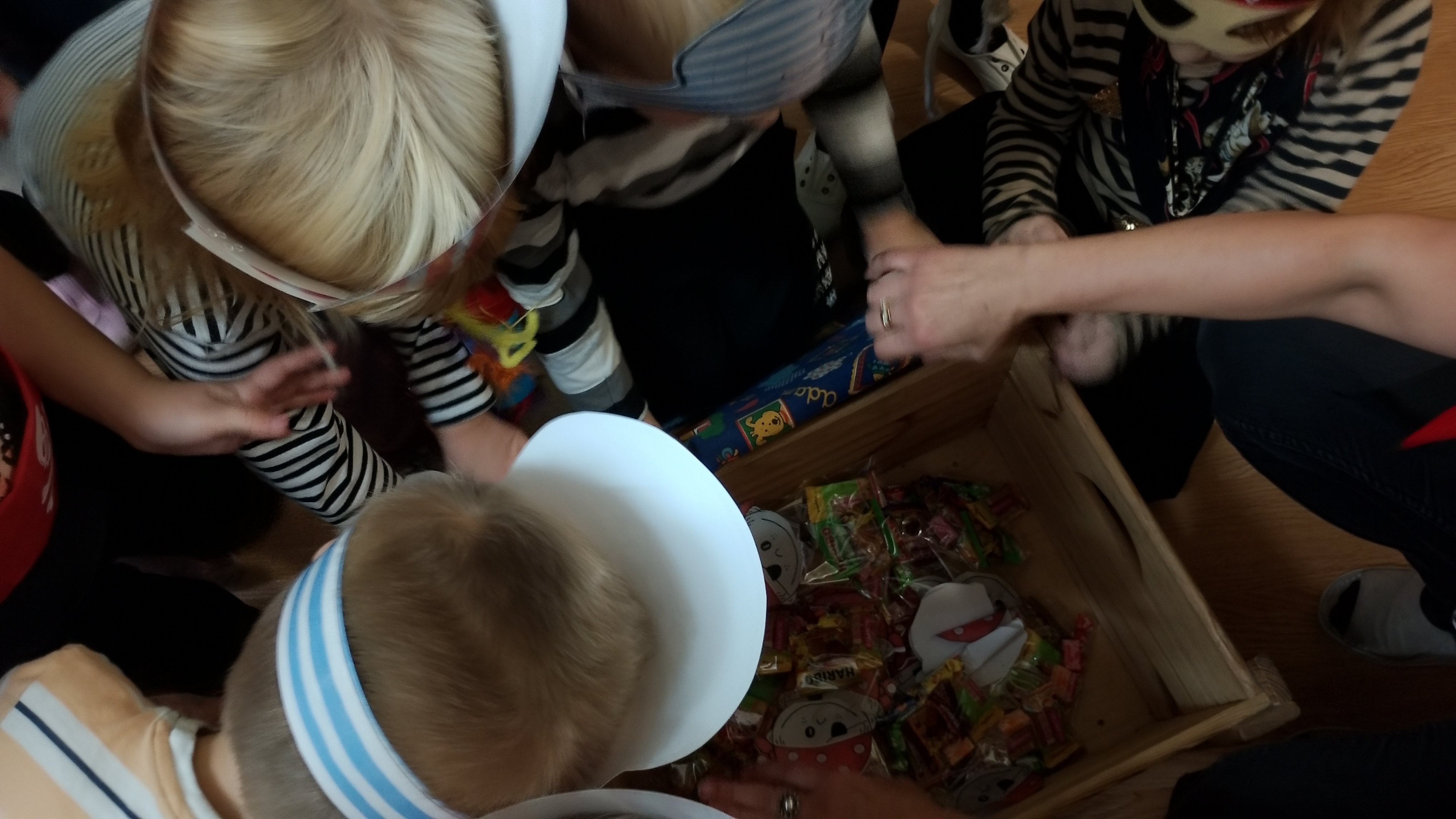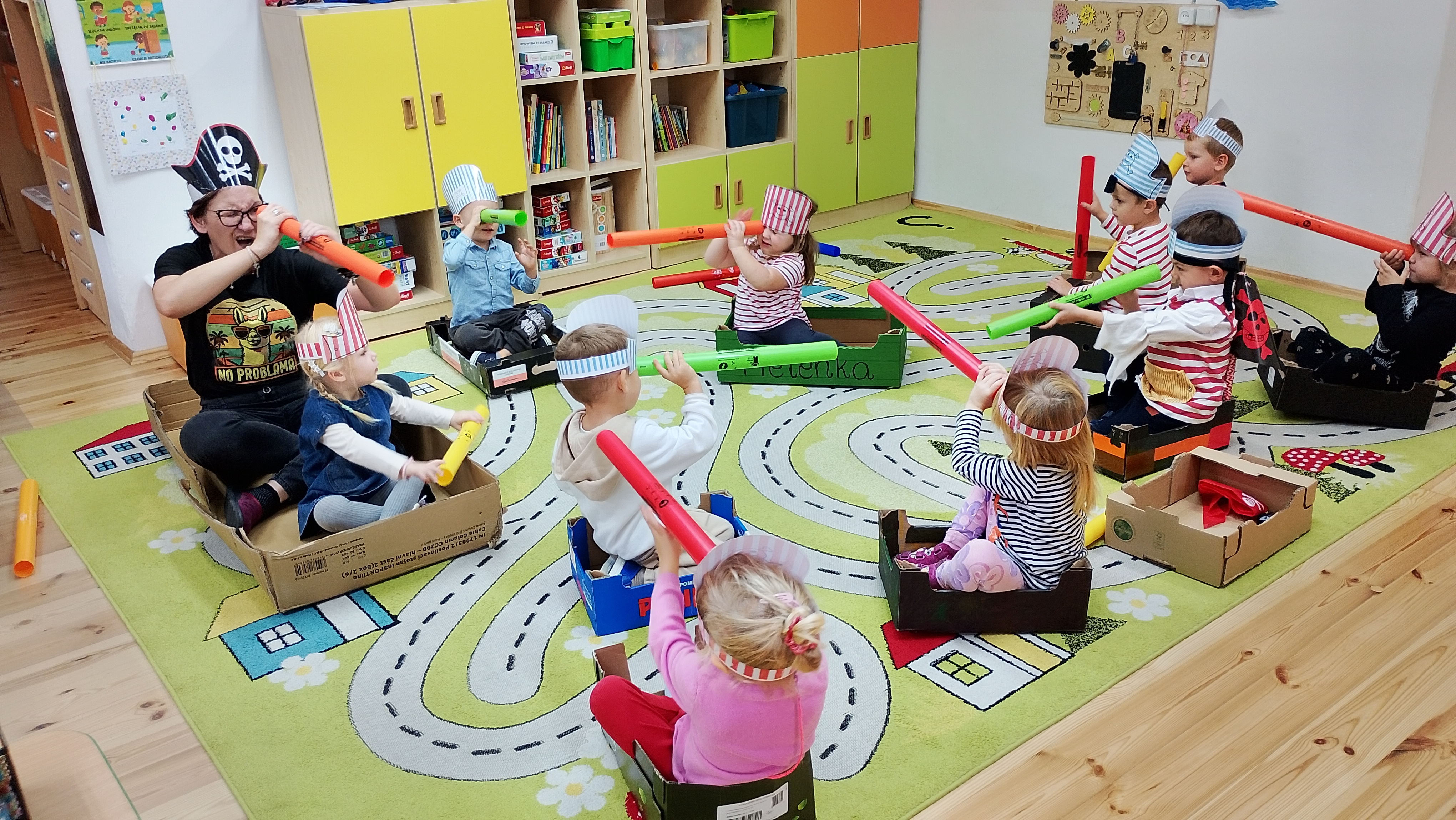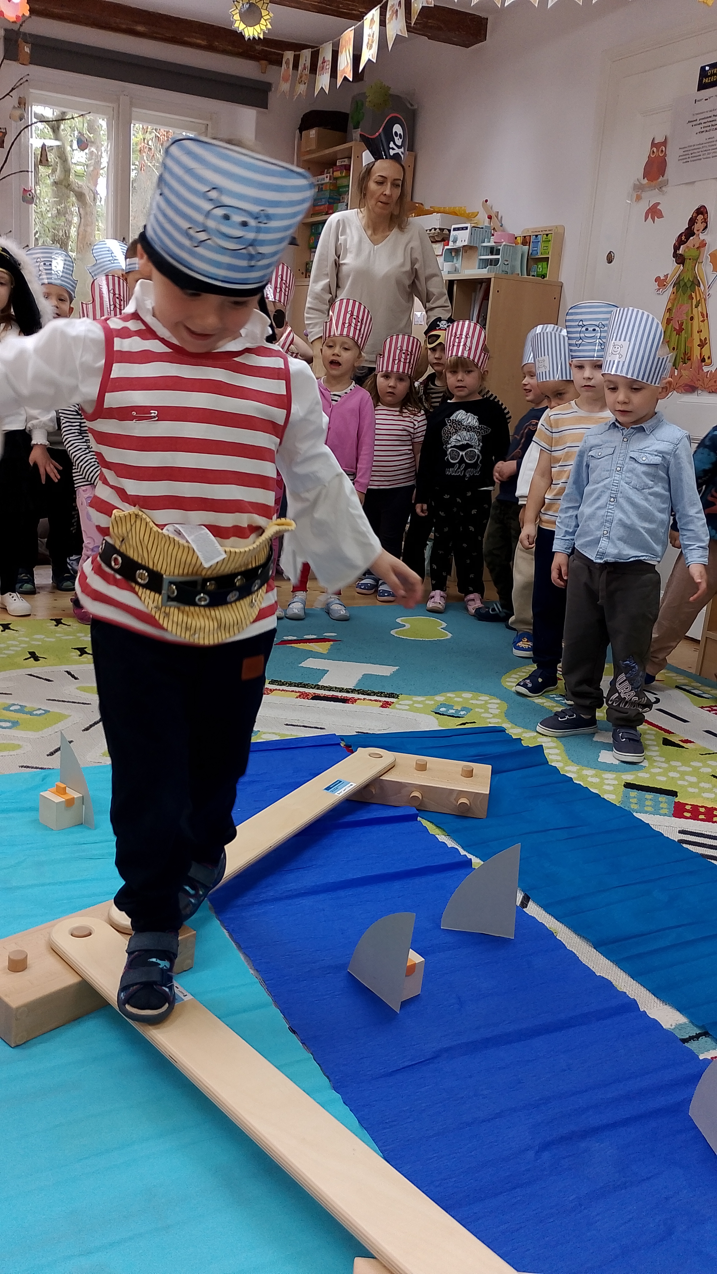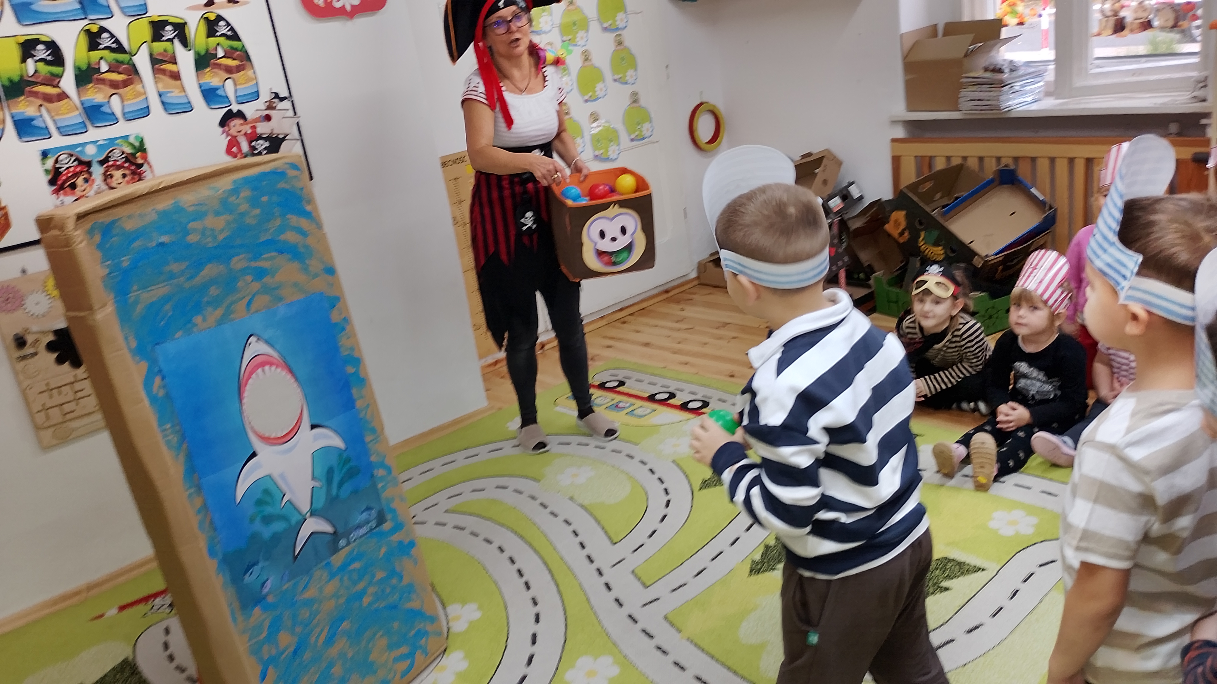 Swą przygodę rozpoczęliśmy, gdy starszacy wpadli z Panią Kasią ( ojjj przepraszam... Kapitanem piratów ...) do sali maluchów z listem w butelce .... A w nim mapa do skarbów od kapitana Hucka, oraz zadaniami do wykonania. Na dobry początek pani Eliza dodała nam siły i energii do działań słodkościami. Żeby znaleźć skarb, musieliśmy poruszać się zgodnie ze strzałkami do zadań umieszczonych w przedszkolu. Pierwsze zadanie nie było łatwe, każdy musiał przejść po kładce. Zadanie było o tyle trudne, bo można było spaść i nadziać się na .... Rekiny ... Na dodatek zadanie musieli wykonać.... dosłownie wszyscy !. Następnie trzeba było nakarmić rekina, ułożyć z puzzli papugę kapitana i dopiero po tych wszystkich zadaniach mogliśmy odnaleźć drogę do skrzyni skarbów .... Słodkich skarbów.... A to nadal nie było koniec naszej przygody. Trzeba było wrócić do przedszkola, więc wszyscy wsiedli w swoje łodzie i powiosłowaliśmy w nieznanym kierunku. A w przedszkolu .... Na obiad ... Ojjj .. pyszności. Ten dzień nie mógł się zakończyć inaczej..... Pirackie hamburgery.... !!!!!