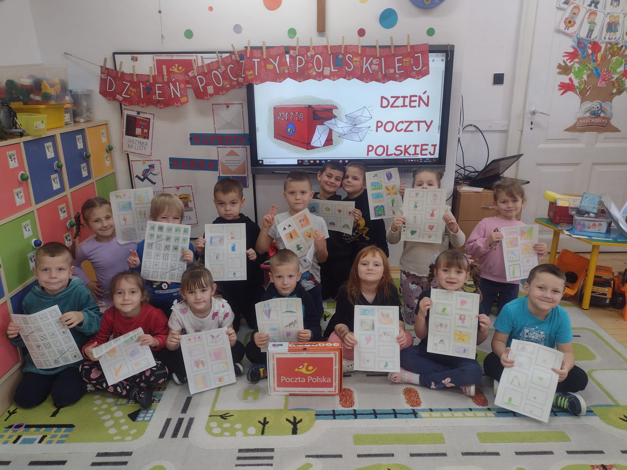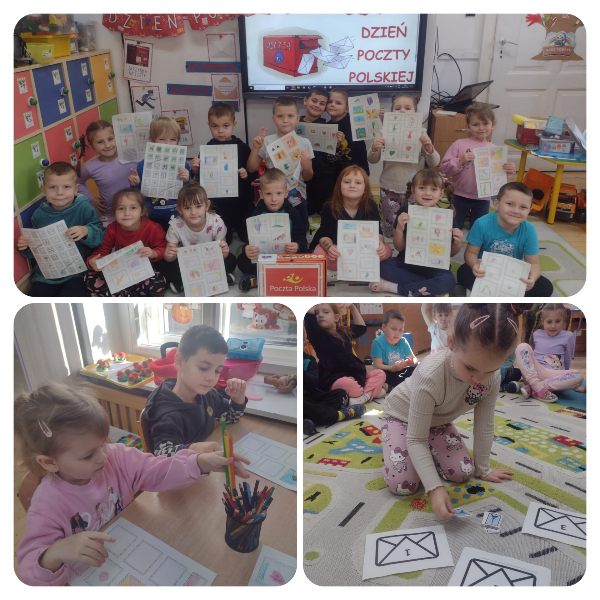 " Grupa "Sówki" obchodziła dzisiaj Dzień Poczty Polskiej. Rozmawialiśmy o pracy na poczcie, o pracy listonosza, jak pisze się list i jak się go wysyła. Poznaliśmy jego drogę do odbiorcy. Nie tylko uczyliśmy się,ale tworzyliśmy też własne znaczki. Przy okazji Dnia Poczty Polskiej powstała w sali "Sówek" skrzynka pocztowa. Dzieci mogą codziennie od poniedziałku do piątku wrzucać do niej listy dla kolegów i koleżanek. Mogą je zrobić w przedszkolu i w domu również.Mają te listy powodować uśmiech na twarzach i radość w sercach❤️. W piątek listonosz będzie te listy wręczał odbiorcom☺️. (Nie muszą być w kopertach?). Pierwsze listy już wrzucone ?! "
