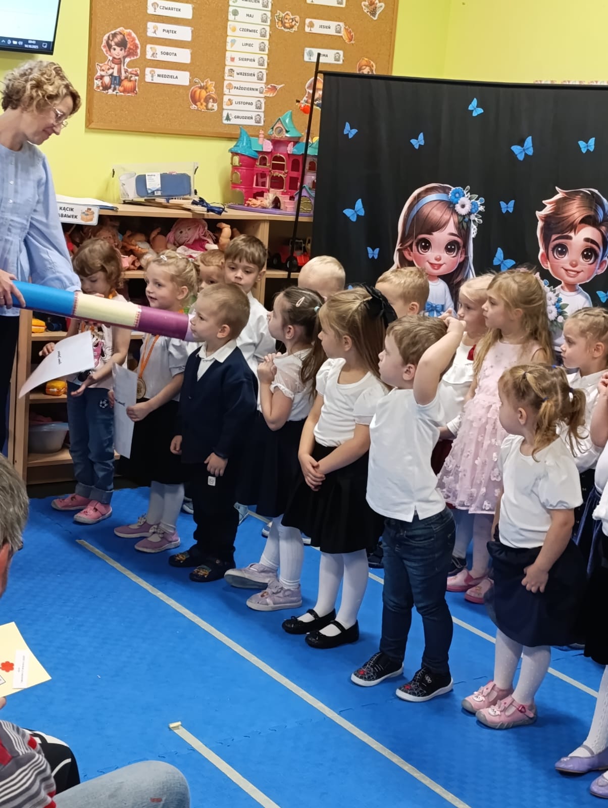 Pani Dyrektor Karolina Busza, przy pomocy czarodziejskiej kredki dokonała symbolicznego aktu pasowania, witając dzieci w gronie przedszkolaków.