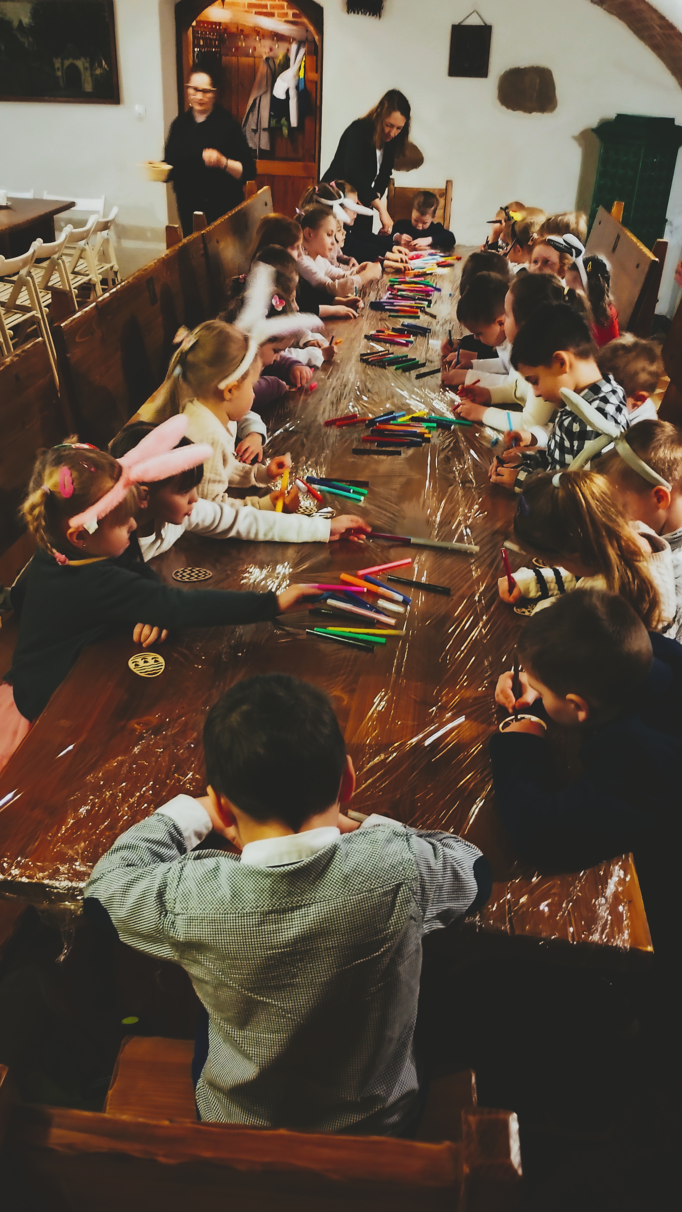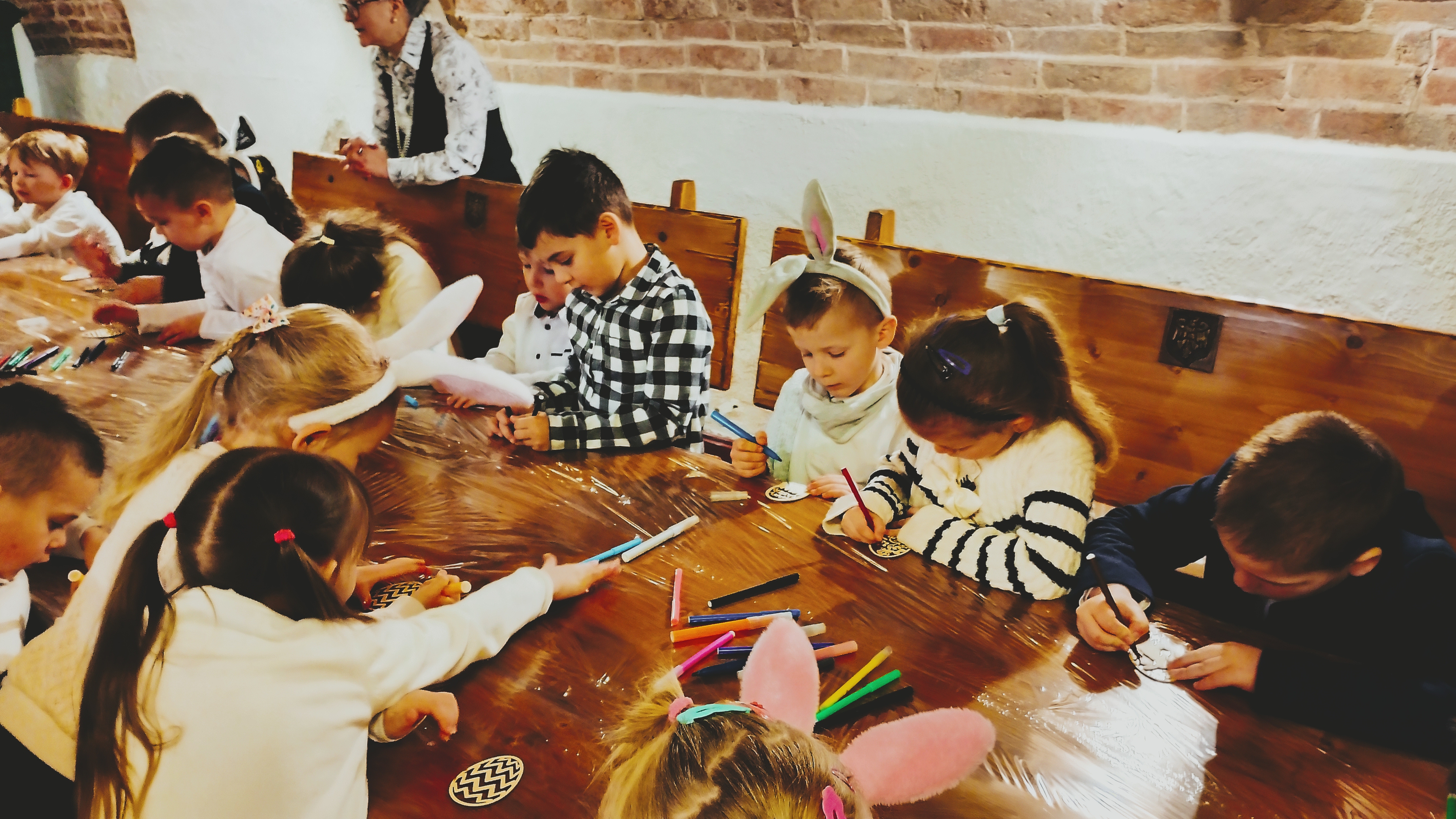 Ostatniego dnia przed przerwą świąteczną wybraliśmy się do Pałacu w Trzeboszu na spotkanie z zajączkiem. Spotkanie rozpoczęliśmy od plastycznych warsztatów.