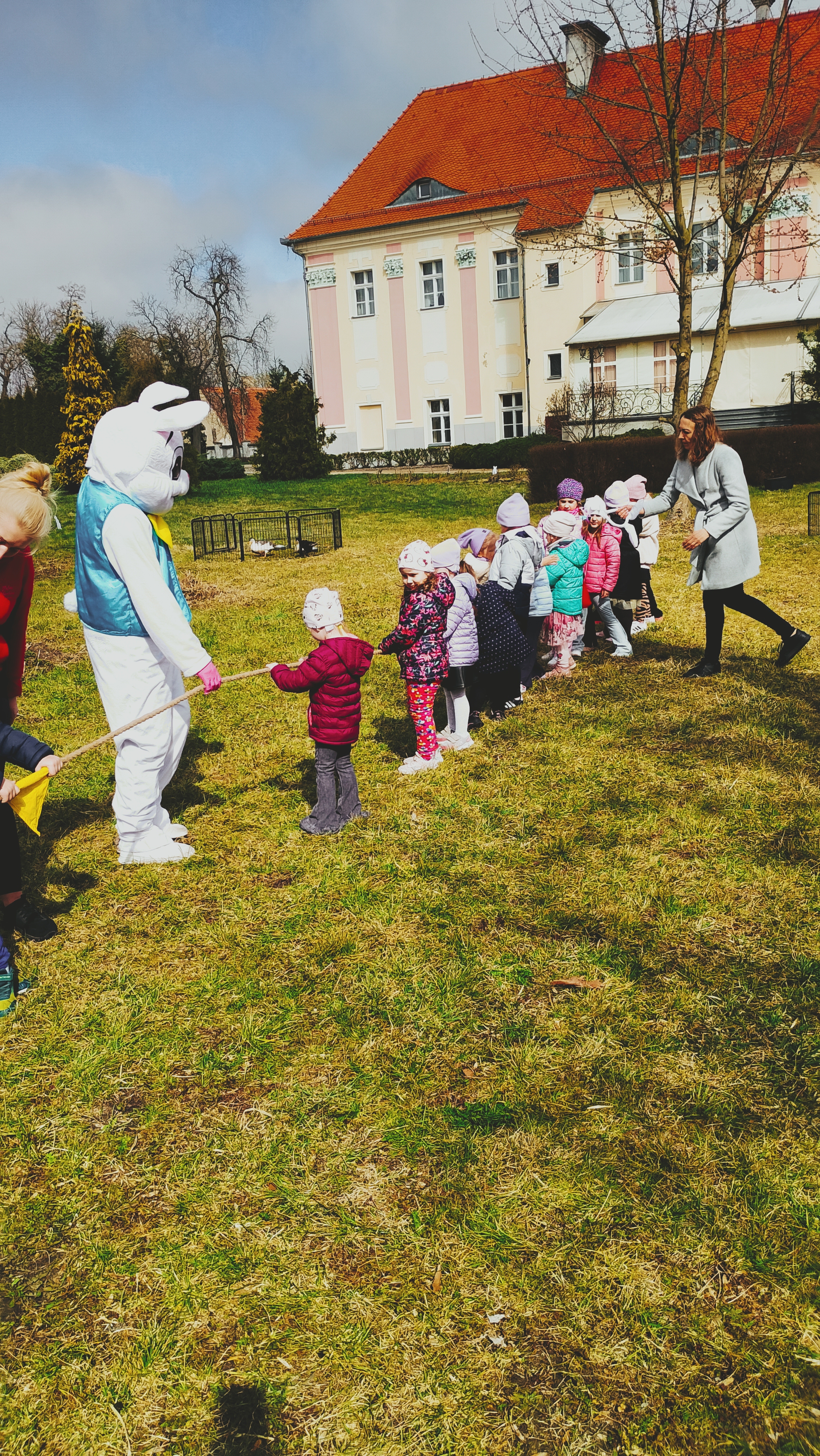 Mieliśmy okazję poznać "Grażynę" - piękną kurę . Zwiedzaliśmy też zakamarki pałacu, poznając jego historię. Następnie wybraliśmy się do ogrodu. Zbierając pogubione marchewki, dotarliśmy do niego - zajączka, który schował się za krzakami. Oj co to były za szaleństwa - nawet prezenty się znalazły