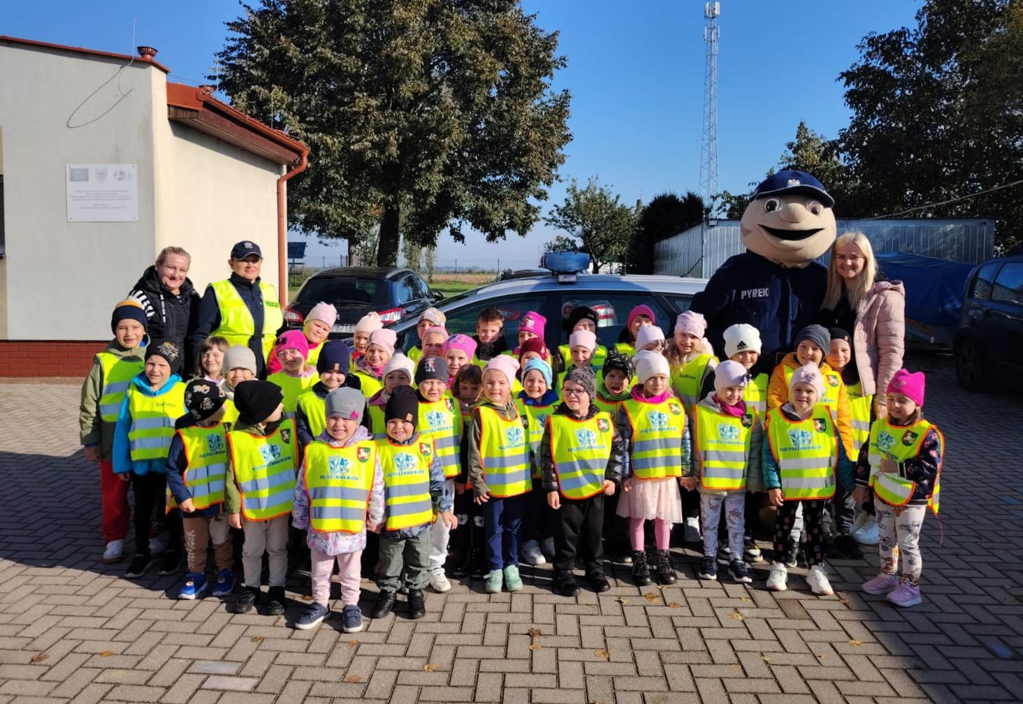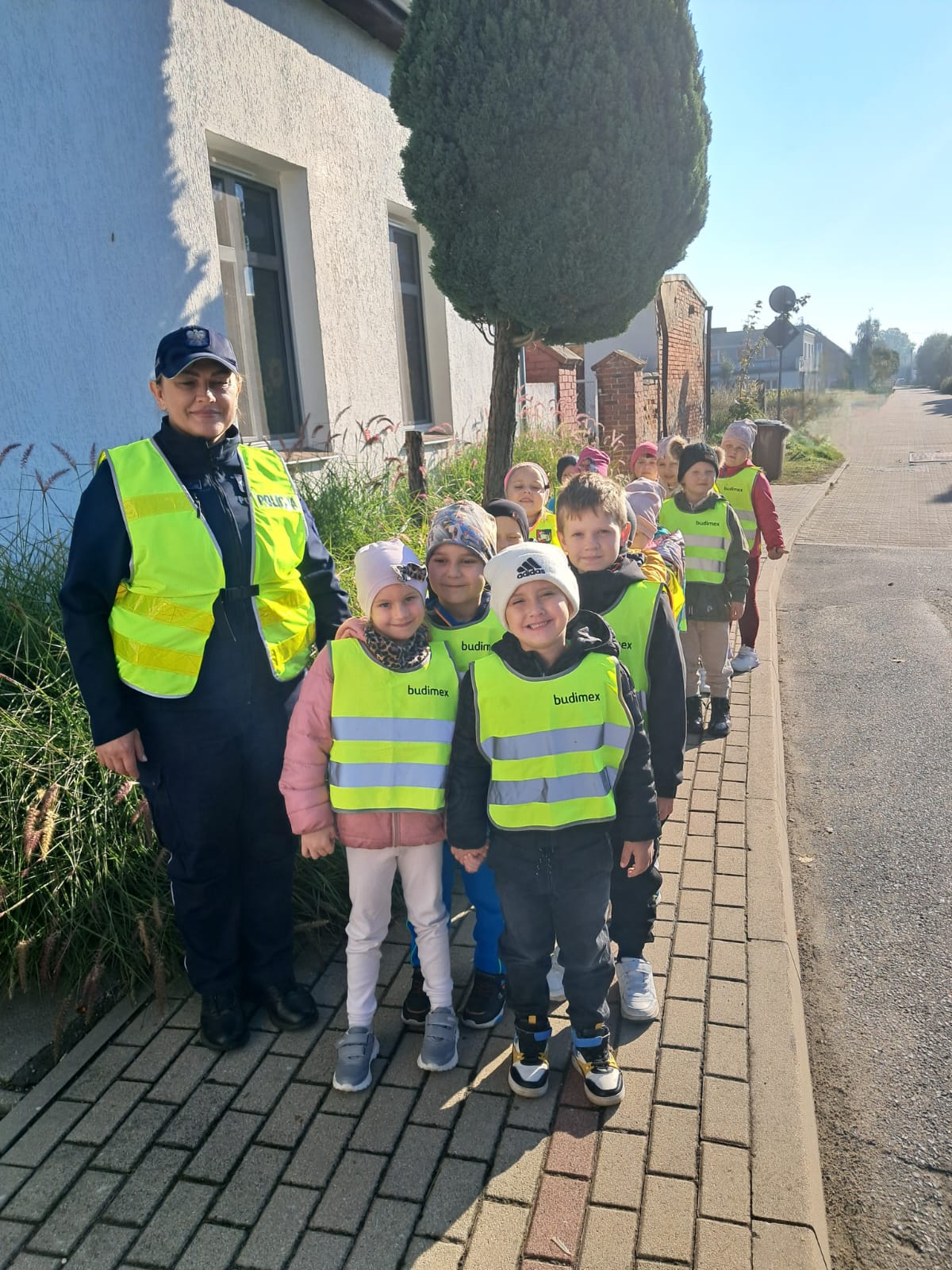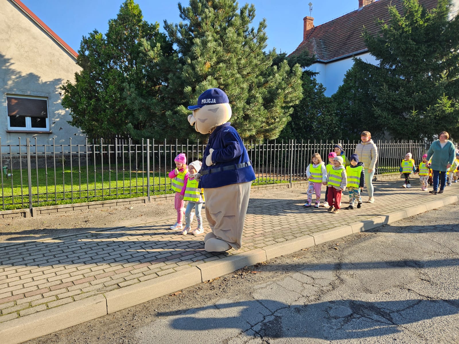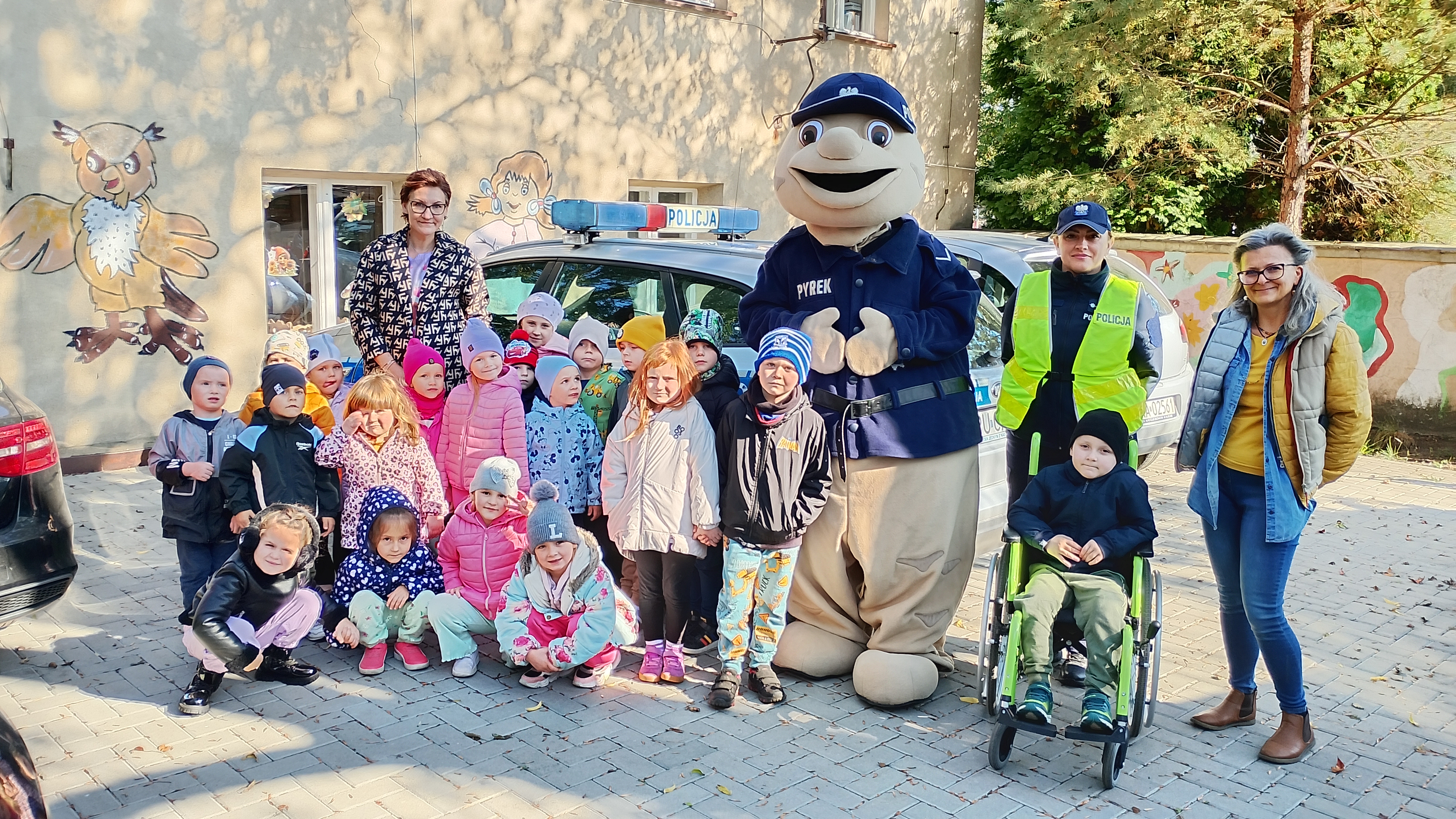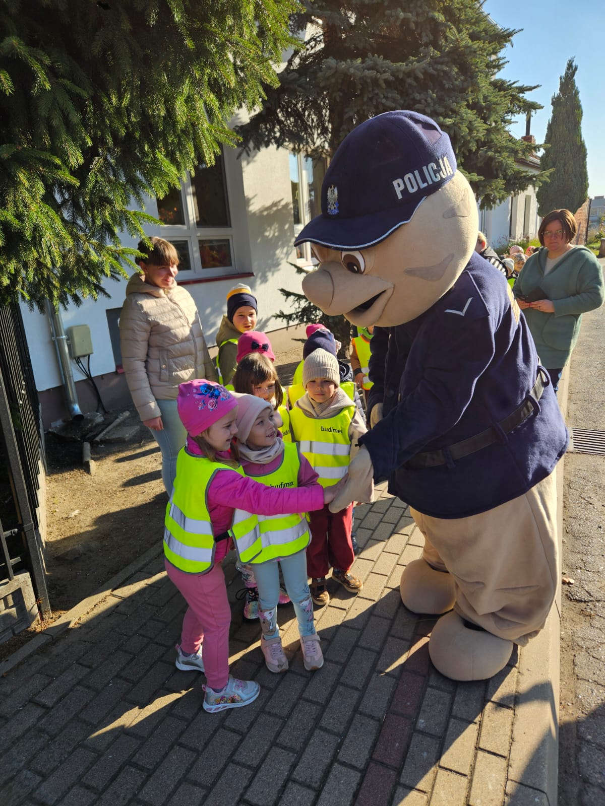 Dziś nasze przedszkola odwiedził sierżant Pyrek wraz z Panią asp.sztab. Katarzyna Łacinnik. Przypominając zasady ruchu drogowego wspólnie przechodziliśmy przez przejście dla pieszych.