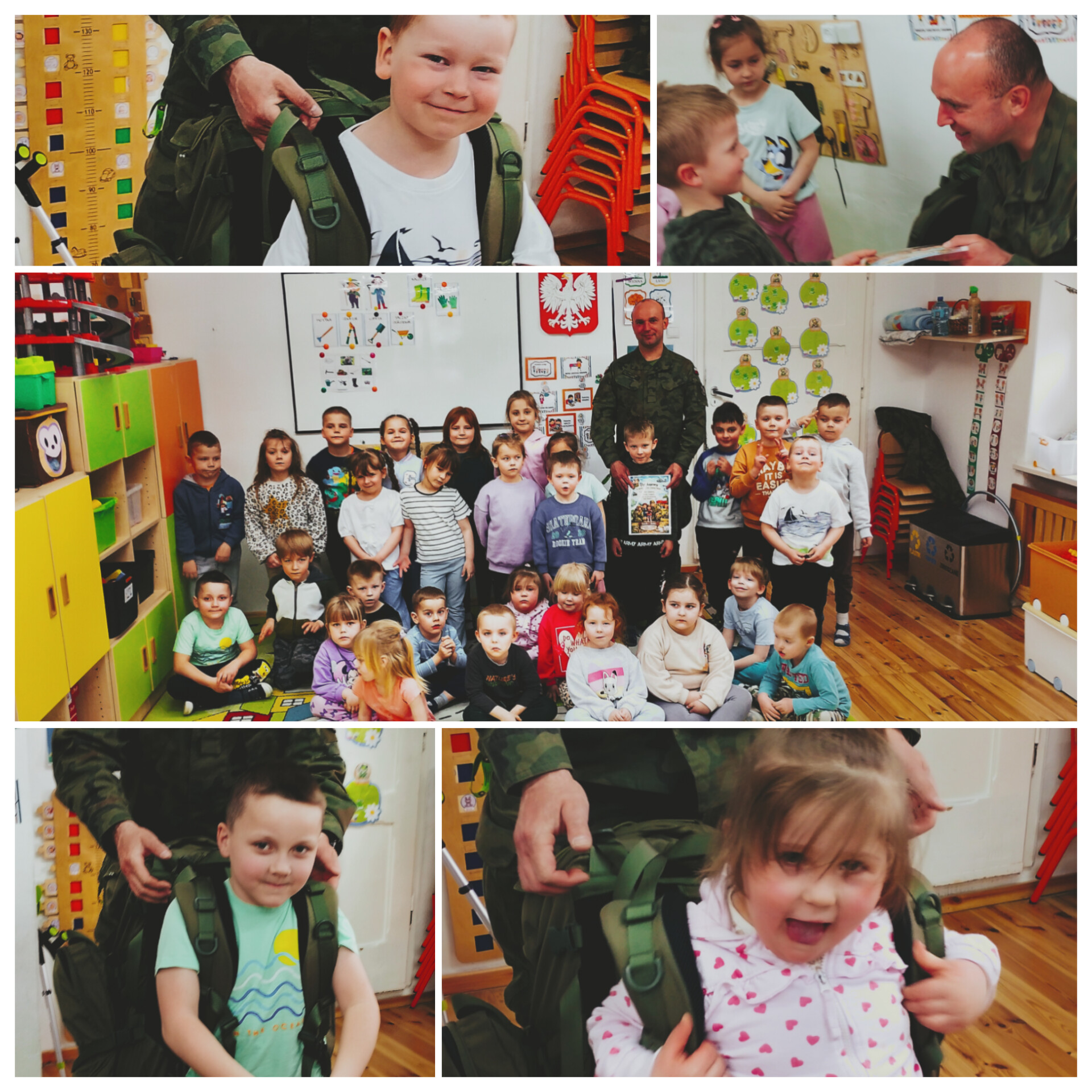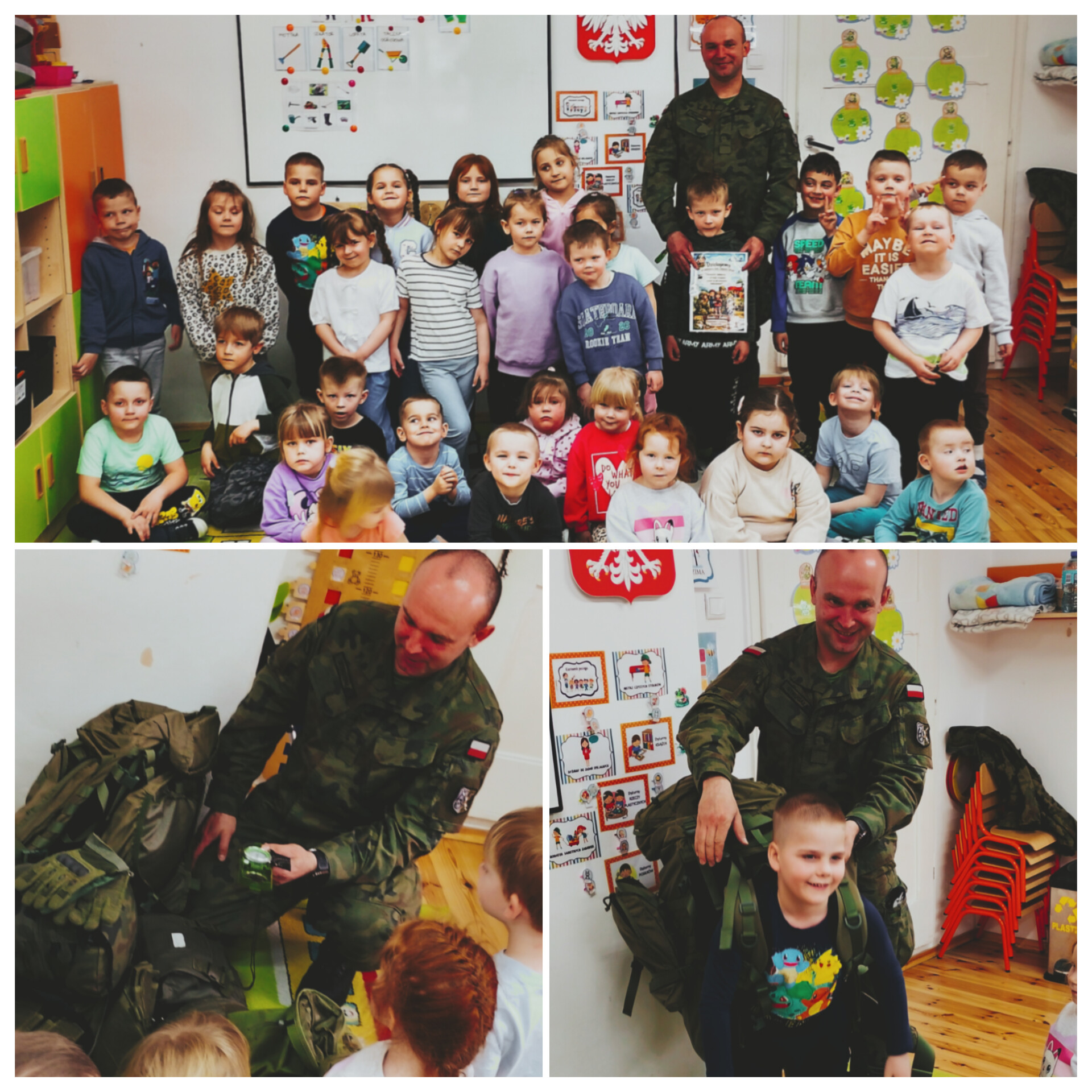 Pan Łukasz jest zawodowym żołnierzem, a celem jego wizyty było przybliżenie dzieciom swojego zawodu. Opowiadał nam, na czym polega codzienna służba wojskowa. Mogliśmy też sprawdzić, co kryje się w ogromnym plecaku naszego gościa.